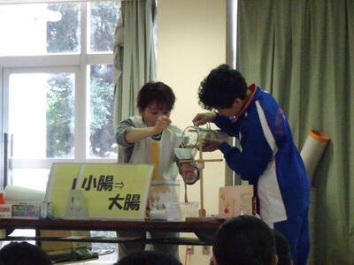 2年生は梶本教頭先生による「消化と吸収」について学習しました。捨てられてしまう食材やだ液や胃液の消化酵素と同じ成分の入っている薬をミキサーにかけ、食べ物からうんちをつくる実験をしました。最後に羊の腸袋に充填し、それを塩漬けし脱水したのち、あらかじめ前日から準備しておいた物を絞り出し、完成した人工のうんちを観察しました。興味津々で授業を受けている生徒の表情はとても活き活きとし、貴重な体験をすることが出来ました。